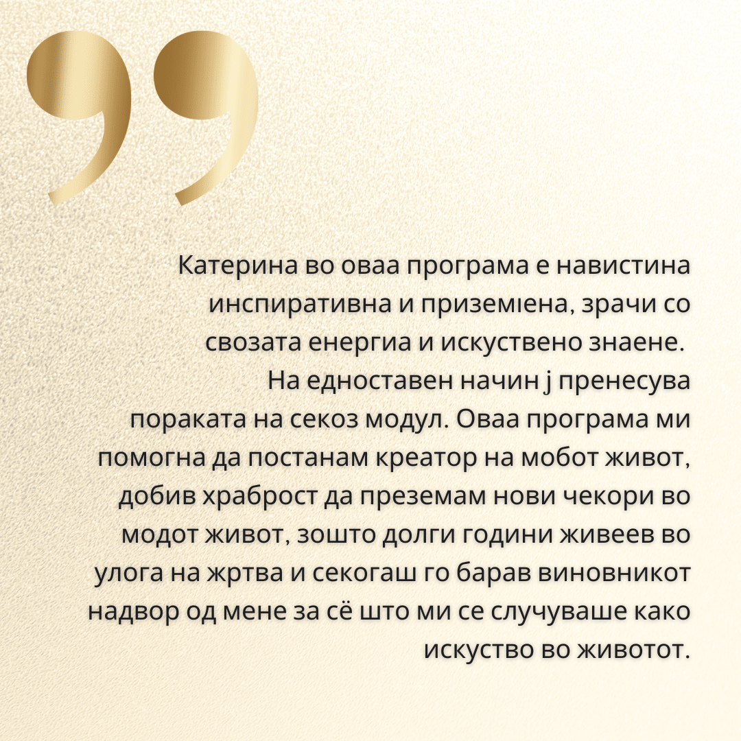 Катерина е магистер по психолошки науки, советник за личен развој, учител по Mindfulness, терапевт во енергетско поле и семејни констелации, НЛП мастер и автор.